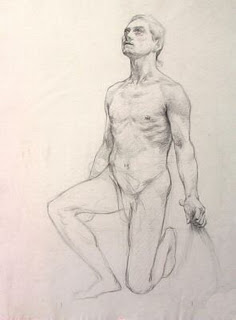 Standing Male Nude --- Pay close attention to the model's left hand. It appears Thivier had some problems with the foreshortening of the forearm and hand and flubbed it up. The hand seems out of proportion. I guess even accomplished artists have their off days. Compare his missed application in drawing that hand and the same foreshortening problem on the Yohn standing male nude in the previous entry and how Yohn handled the same problem and succeeded. Drawing is about observation. I once heard a story about Manet and Monet as they sat sketching on the riverbank. After some time Monet had a pile of wadded up sketches piled up at his feet. His friend looked over sympathetically and smiled. "Having an off day my friend?" Sometimes genius just doesn't come easily, even to the most accomplished of us.